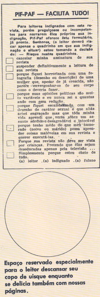 A revista independente Pif-Paf foi lançada em 1964, mais precisamente no dia 21 de maio, e tinha entre os colaboradores Reginaldo Fortuna, Ziraldo, Jaguar, Leon Eliachar e Stanislaw Ponte Preta. Humor e irreverência eram o que não faltava, como nesse exemplo: em uma das edições da revista, uma página continha o desenho de um círculo. E qual o motivo? A legenda explicava: “Espaço reservado especialmente para o leitor descansar seu copo de uísque enquanto se delicia também com nossas páginas”. O uísque!